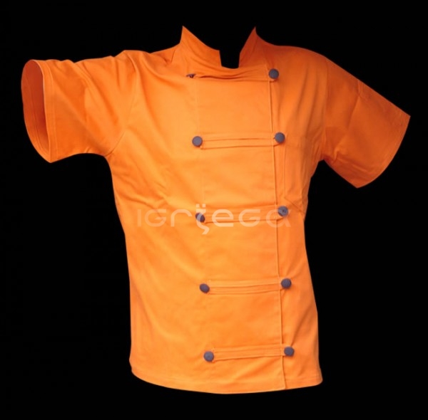 Gabardina de 6 oz. o Poplin de algodón y polyester, colores varios; manga corta o largo a elección; cuello mao recto; presillas en cruce delantero.
