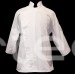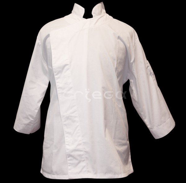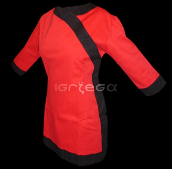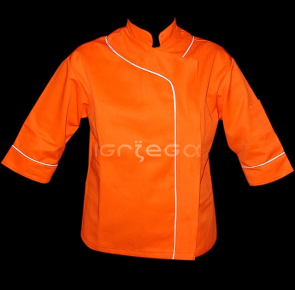 Gabardina de 6 oz. o Poplin de algodón y polyester, colores varios; manga 3/4; cuello mao; broche arandela escondido.