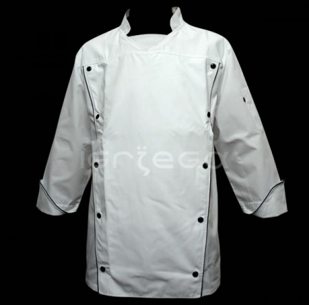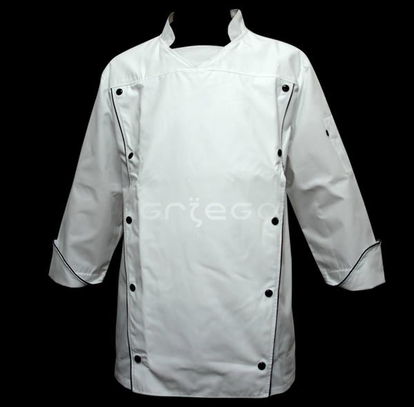 Gabardina 6 oz. o Poplin polyester/algodòn, manga larga, cuello con reeb y delantera con botón snap, vivo en manga y en solapa delantera. Varios colores.