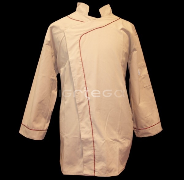 Gabardina de 6 oz. o Poplin de algodón y polyester, colores varios; manga 3/4; broche arandela escondido; cuello mao; vivo en escote y puños.