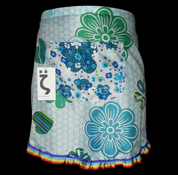 Telas varias con bolsillo y tiras combinadas; un bolsillo central; volados en el borde.