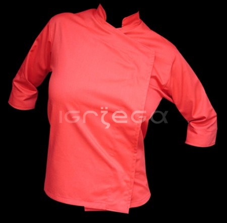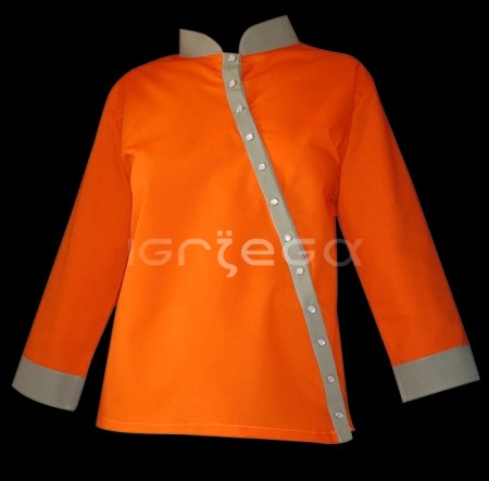 Gabardina de 6 oz. o Poplina de algodón y polyester, colores varios; manga 3/4; cuello mao; broche arandela escondido.