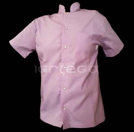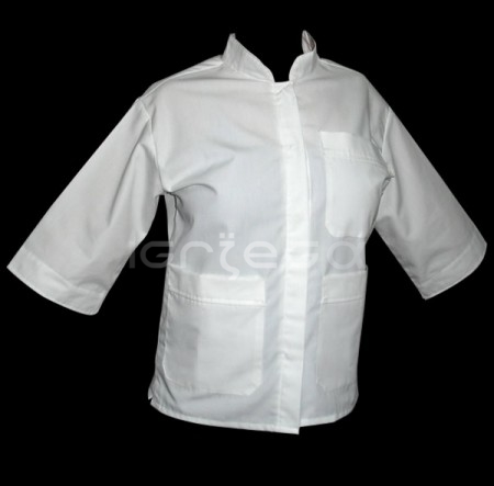 Acrocel o Poplin, broche perla o arandela; cuello mao; manga corta; un bolsillo superior.